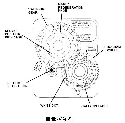 按樹脂罐內裝填樹脂的交換能力算出周期制水量,減去必要的儲備量后的值就是所設定的流量。向外提出流量盤并轉動,使設定的流量數對準流量盤上的白色圓點,然后松開流量盤,注意讓齒輪嚙合好。