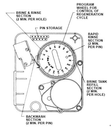定時器邊緣上標有一圈數字(0-160),從“0”開始的首先組銷子是控制反沖洗時間的。